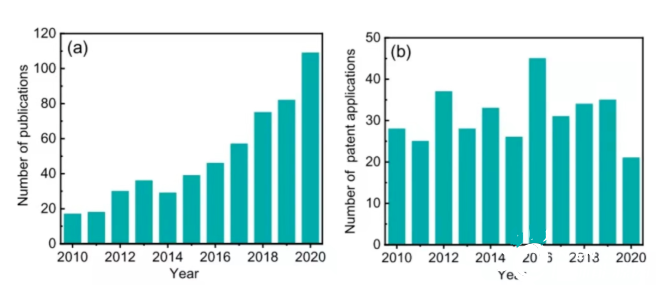 圖1:(a) 每年檢索“海水分解”題目時(shí),摘錄的出版物數(shù)目;(b)在Patsnap數(shù)據(jù)庫(kù)中搜索標(biāo)題、摘要或權(quán)利要求中“海水”和“電解”等主題時(shí),每年在Patsnap數(shù)據(jù)庫(kù)中發(fā)現(xiàn)的專利申請(qǐng)數(shù)量。