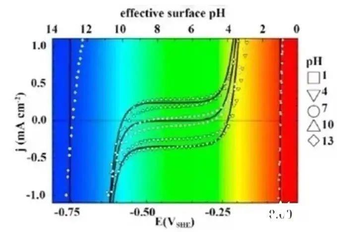 具體來說,隨著電解電流密度的增加,電極表面局部酸堿度會(huì)急劇變化(圖3:在H?飽和、無緩沖的pH1~13溶液中,通過循環(huán)伏安法獲得的電流密度-表面酸堿度關(guān)系),因此可能導(dǎo)致Ca(OH)?和Mg(OH)?沉淀的形成,并阻塞陰極活性位點(diǎn)。