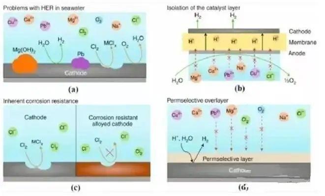 這些電解槽直接用來電解海水時(shí),海水復(fù)雜的天然成分會(huì)對(duì)電解產(chǎn)生影響。其中主要問題是離子交換膜的物理或化學(xué)堵塞和金屬組件的腐蝕,例如海水中的Na?,Mg2? 和Ca2?離子會(huì)降低HTWE和PEMWE質(zhì)子交換膜的性能;