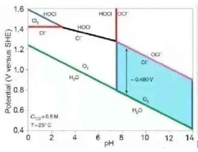 圖5:天然海水模型中OER和氯化物相關(guān)的Pourbaix圖