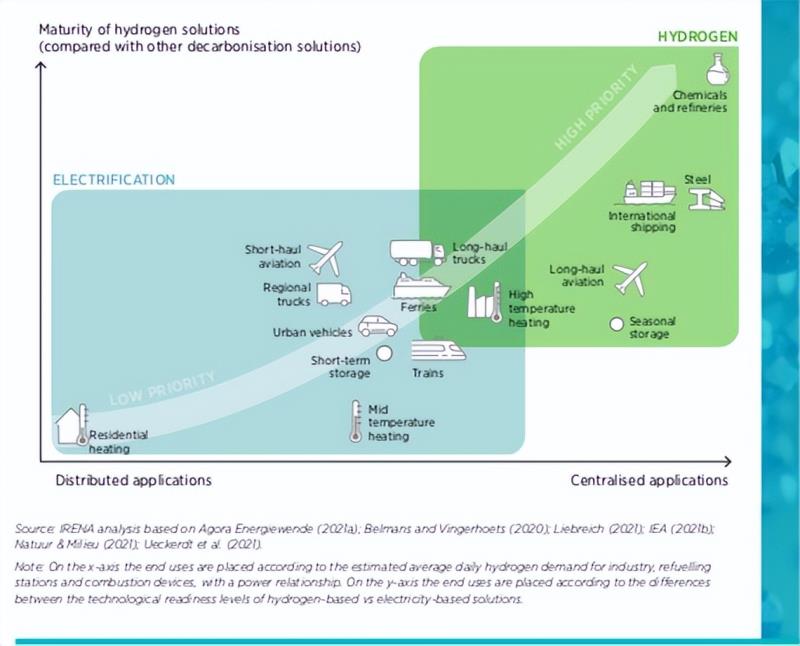 根據(jù)《報(bào)告》,綠氫戰(zhàn)略的“優(yōu)先權(quán)設(shè)定”,取決于對(duì)不同因素的評(píng)估,其中一些因素在全球不同國家中是相似的,包括脫碳解決方案的技術(shù)成熟度和氫氣需求的潛在規(guī)模。如上圖所示,兩個(gè)因素疊加下,氫的工業(yè)用途應(yīng)作為最優(yōu)先的終端應(yīng)用之一,因?yàn)樵诳深A(yù)見的未來,該領(lǐng)域替代氫的方案仍然缺乏,同時(shí),工業(yè)用氫的需求足夠大,可以通過規(guī)模化使向綠氫應(yīng)用的轉(zhuǎn)變更具成本效益。