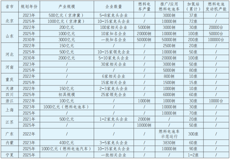 從主要省市區(qū)氫能產(chǎn)業(yè)發(fā)展規(guī)劃所制定的目標(biāo)可以清晰地看出,燃料電池汽車及其產(chǎn)業(yè)鏈?zhǔn)歉鞯匕l(fā)展氫能的主因,甚至是唯一選擇。表1中列舉的13個(gè)省市自治區(qū)中,除了寧夏以外,其余省市自治區(qū)的氫能產(chǎn)業(yè)規(guī)劃都具體為氫燃料電池汽車的生產(chǎn)或推廣目標(biāo),其中還有兩個(gè)?。ㄉ綎|和浙江)規(guī)劃了氫燃料電池發(fā)動(dòng)機(jī)產(chǎn)能目標(biāo)。對(duì)于氫能在其他領(lǐng)域的應(yīng)用則沒有涉及。