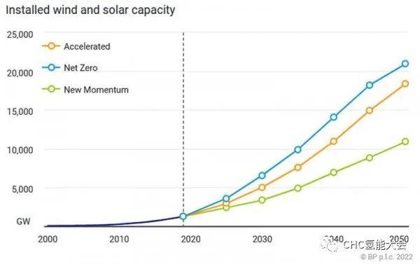 在《2022年能源展望》中,在加速和凈零情景下,風(fēng)能和太陽能裝機容量的平均增長速度在21世紀(jì)30年代為每年600MW-750MW,然后在21世紀(jì)40年代為每年700MW-750MW。這表明了在容量增加方面的顯著加速。