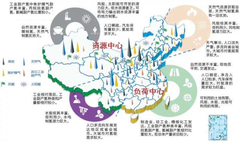 但是中國風(fēng)資源、光資源和水電資源分布都呈現(xiàn)出極強的地域特征。西北地區(qū)風(fēng)光資源豐富且開發(fā)潛力巨大,但水資源相對較少。西南地區(qū)水資源和水電資源都十分豐富,看起來適合發(fā)展電解水。但西南地區(qū)經(jīng)濟發(fā)展程度較低,人口密度相對較少。缺乏廣泛的氫能應(yīng)用市場。東南沿海地區(qū)海上風(fēng)電資源、水源充足,并且工業(yè)門類齊全、城市密集,同時具備綠氫的制造和應(yīng)用潛力。