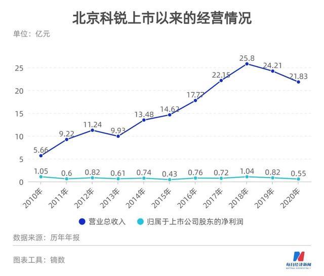 上市十多年,北京科銳的核心業(yè)務(wù)一直都是配電設(shè)備制造。然而,“聚焦主業(yè)”并未給北京科銳帶來(lái)持續(xù)的高增長(zhǎng)。2010年至2019年,其歸屬于上市公司股東的凈利潤(rùn)的年均增長(zhǎng)率僅為1.64%,最高峰時(shí)也只有1.04億元。盤子小、步子慢,碰到增長(zhǎng)“天花板”的北京科銳開(kāi)始找出路。