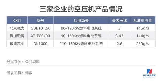 不過(guò),同上述三家企業(yè)的空壓機(jī)產(chǎn)品相比,北京穩(wěn)力的產(chǎn)品在這兩個(gè)指標(biāo)上并無(wú)壓倒性優(yōu)勢(shì)。具體而言,北京穩(wěn)力空壓機(jī)(型號(hào)SDDT012A)的應(yīng)用場(chǎng)景為80~120KW燃料電池系統(tǒng),最大壓比是3.0,最大流量是145g/s。勢(shì)加透博空壓機(jī)(型號(hào)XT-FCC400)的應(yīng)用場(chǎng)景為90~150KW燃料電池系統(tǒng),最大壓比為3.45,標(biāo)準(zhǔn)型流量為144g/s。東德實(shí)業(yè)空壓機(jī)(型號(hào)DK1000)的應(yīng)用場(chǎng)景為110~150KW燃料電池系統(tǒng),在壓比為2.6的條件下,出口流量最大可達(dá)到260g/s。