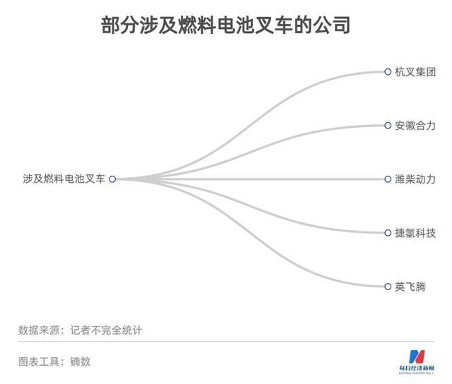 叉車系統(tǒng)同樣有不少企業(yè)正在布局。《每日經(jīng)濟(jì)新聞》記者粗略統(tǒng)計(jì),杭叉集團(tuán)、安徽合力等整車企業(yè),以及濰柴動(dòng)力、捷氫科技、英飛騰等燃料電池企業(yè)都涉及燃料電池叉車業(yè)務(wù)。