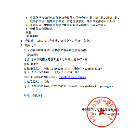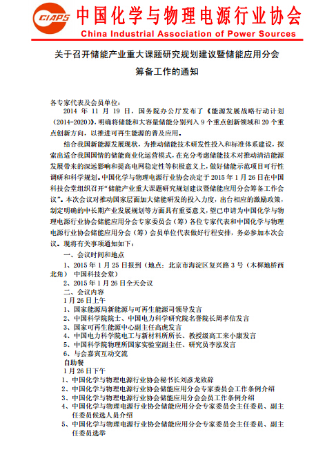 結(jié)合我國新能源發(fā)展現(xiàn)狀,為推動儲能技術(shù)研發(fā)性投入和標準體系建設(shè),探索出適合我國國情的儲能商業(yè)化運營模式,在充分考慮儲能技術(shù)對推動清潔能源發(fā)展帶來的深遠影響和提高電網(wǎng)穩(wěn)定性等積極意義上,做好儲能儲能示范項目可行性調(diào)研和科學(xué)規(guī)劃。中國化學(xué)與物理電源行業(yè)協(xié)會決定將于2015年1月26日在中國科技會堂組織召開“儲能產(chǎn)業(yè)重大課題研究規(guī)劃建議暨儲能應(yīng)用分會籌備工作會議”。本次會議對推動國家層面加大儲能研發(fā)的投入力度,出臺相應(yīng)的激勵政策,制定明確的中長期產(chǎn)業(yè)發(fā)展規(guī)劃等方面具有重要意義,望已申請為中國化學(xué)與物理電源行業(yè)協(xié)會儲能應(yīng)用分會專家委員會(籌)各位專家代表和中國化學(xué)與物理電源行業(yè)協(xié)會儲能應(yīng)用分會(籌)會員單位代表做好行程安排,務(wù)必參加本次會議。現(xiàn)將有關(guān)事項通知如下: