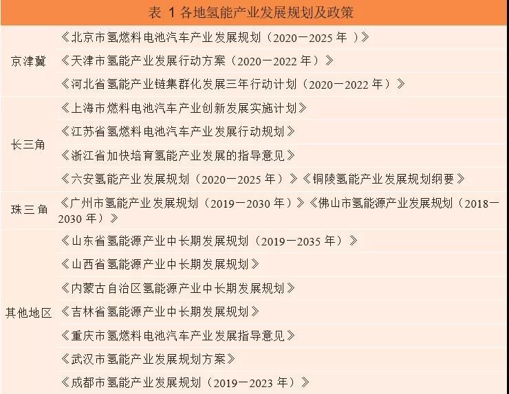 《能源發(fā)展戰(zhàn)略行動計劃(2014— 2020年)》(國辦發(fā)〔2014〕31號)明確將“氫能與燃料電池”作為能源科技創(chuàng)新戰(zhàn)略方向。財政部、科技部、工業(yè)和信息化部、國家發(fā)展改革委聯合發(fā)布的《關于2016— 2020年新能源汽車推廣應用財政支持政策的通知》(財建〔2015〕134號),對于燃料電池汽車的財政補貼提高至20萬元/輛,并提出2017— 2020年除燃料電池汽車外,其他車型補助標準適當退坡?!赌茉醇夹g革命創(chuàng)新行動計劃2016— 2030年》《“十三五”國家戰(zhàn)略性新興產業(yè)發(fā)展規(guī)劃》和《“十三五”國家科技創(chuàng)新規(guī)劃》等國家級規(guī)劃,都將氫能發(fā)展與燃料電池技術創(chuàng)新提升到國家戰(zhàn)略高度,列為重點發(fā)展方向。地方政府和企業(yè)積極探索氫能產業(yè)發(fā)展,出臺了不少支持政策,初步形成制備、儲運、應用等環(huán)節(jié)的完整產業(yè)鏈(見表1)。氫能產業(yè)布局由珠三角、長三角、京津冀等先發(fā)區(qū)逐步向環(huán)渤海、大中原、華北、西北及東北區(qū)域擴展。
