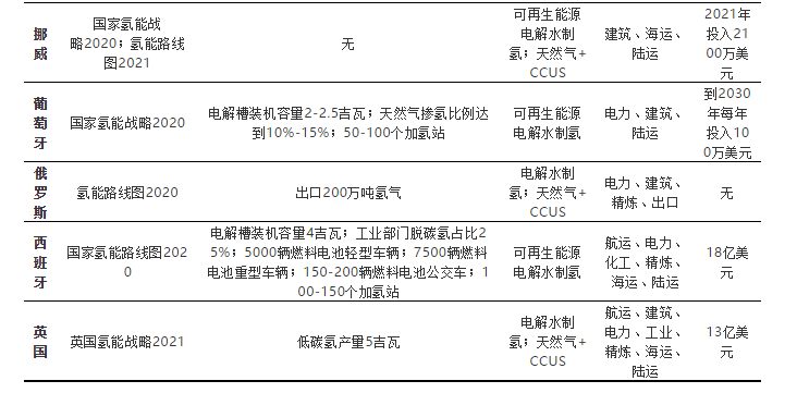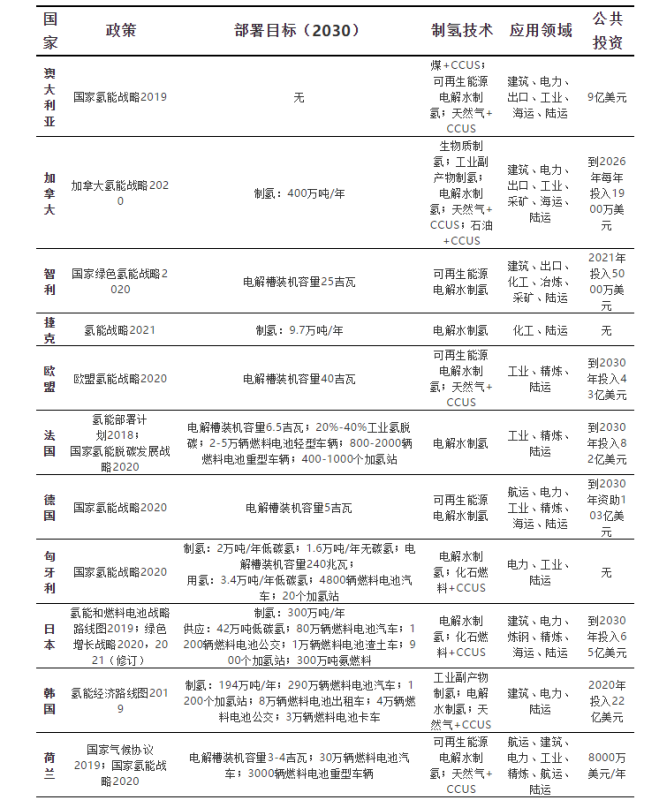 表1 不同國家氫能戰(zhàn)略布局情況