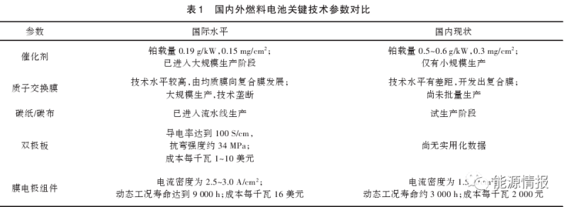 總體來說,制約我國氫能源發(fā)展的還是燃料電池電堆和關(guān)鍵材料。國產(chǎn)電堆在功率密度、系統(tǒng)功率、壽命等方面與先進水平相比還有差距;質(zhì)子交換膜、催化劑、膜電極等關(guān)鍵材料和高壓比空壓機、氫氣循環(huán)泵等關(guān)鍵設(shè)備依賴進口,產(chǎn)品價格較高,國內(nèi)外燃料電池關(guān)鍵技術(shù)參數(shù)對比如表1所示。因此,我國需注重核心材料和關(guān)鍵技術(shù)的突破,補足短板。
