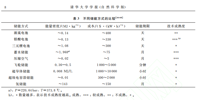 3)電磁儲(chǔ)能,包括超導(dǎo)體儲(chǔ)能和超級(jí)電容 器儲(chǔ)能.氫儲(chǔ)能的基本原理是電解水產(chǎn)生氫氣和氧氣,可以將其看作是化學(xué)儲(chǔ)能的延伸。表3歸納了不同儲(chǔ)能方式的能量密度、成 本、儲(chǔ)能期限和技術(shù)成熟度。對(duì)比可知,氫儲(chǔ)能相比于其他儲(chǔ)能方式有諸多優(yōu)點(diǎn).氫儲(chǔ)能的能量 密度顯著高于其他儲(chǔ)能方式,儲(chǔ)能期限較長(zhǎng),滿(mǎn) 足長(zhǎng)時(shí)間儲(chǔ)能的需求,可實(shí)現(xiàn)可再生能源的跨季 儲(chǔ)能和跨區(qū)域能量傳遞.此外,電解水制氫可以提高可再生能源利用率,減少化石燃料的使用, 提高能源體系清潔化。氫儲(chǔ)能成本低于電化學(xué)儲(chǔ)能、電磁儲(chǔ)能和飛輪儲(chǔ)能,盡管略高于發(fā)展時(shí)間較久的壓縮空氣儲(chǔ)能和蓄水儲(chǔ)能,但隨著氫氣制備和儲(chǔ)運(yùn)技術(shù)的進(jìn)一步發(fā)展,市場(chǎng)規(guī)模的進(jìn)一步擴(kuò)大,成本將會(huì)進(jìn)一步降低.氫儲(chǔ)能是前景廣闊的可再生能源儲(chǔ)能方式,可在能源互聯(lián)網(wǎng)的構(gòu)建方面發(fā)揮重要作用。