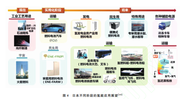 如圖4所示,日本對(duì)不同階段氫能在不同領(lǐng) 域的應(yīng)用進(jìn)行了分析,顯示了氫能在當(dāng)下能源系 統(tǒng)中的重要位置以及未來(lái)能源互聯(lián)網(wǎng)系統(tǒng)中的具體應(yīng)用前景.目前,日本比較成熟的氫能應(yīng)用包括石油精煉、光纖制造等工業(yè)制造領(lǐng)域和被當(dāng)作高能燃料使用的航空航天領(lǐng)域;目前處于實(shí)用化階段的應(yīng)用主要包括燃料電池汽車(chē)和家用燃料電池電站;隨著氫能相關(guān)技術(shù)的不斷進(jìn)步, 未來(lái)還會(huì)進(jìn)一步被用于業(yè)務(wù)產(chǎn)業(yè)用燃料電池發(fā)電、家用或特殊用途的燃料電池、不同類(lèi)型的燃料電池交通工具(包括業(yè)務(wù)用車(chē)、公共汽車(chē)、列車(chē)、船、飛機(jī))等 各種備用電源,以及更多的工業(yè)應(yīng)用等。