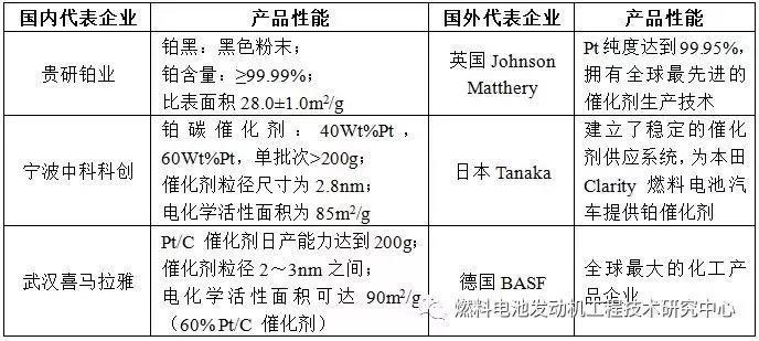 燃料電池催化劑的國外生產(chǎn)商主要有英國JohnsonMatthery,德國BASF,日本Tanaka,日本日清紡,比利時Umicore等;國內(nèi)有貴研鉑業(yè),武漢喜馬拉雅,中科中創(chuàng)、蘇州擎動動力、昆山桑萊特等。