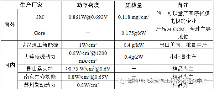 表3膜電極生產(chǎn)廠家及產(chǎn)品性能