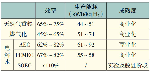 現(xiàn)階段全球氫氣生產(chǎn)幾乎全部來自化石能源,其 中48%來自天然氣重整,30%來自油部分氧化,18%來自煤氣化,僅4%來自電解水,而高溫蒸汽電解、人工光合作用、生物制氫等新興工藝均處于早期發(fā)展階段。各類制氫技術的基本參數(shù)見表1。成本上,目前天然氣重整方式最低,在美國大型天然氣重整制氫成本為0.05歐元/kWh(2歐元/kg H2)。電解制氫成本非常高,倫敦某加氫站氫氣成本為0.25歐元/kWh(10歐元/ kg H2)。