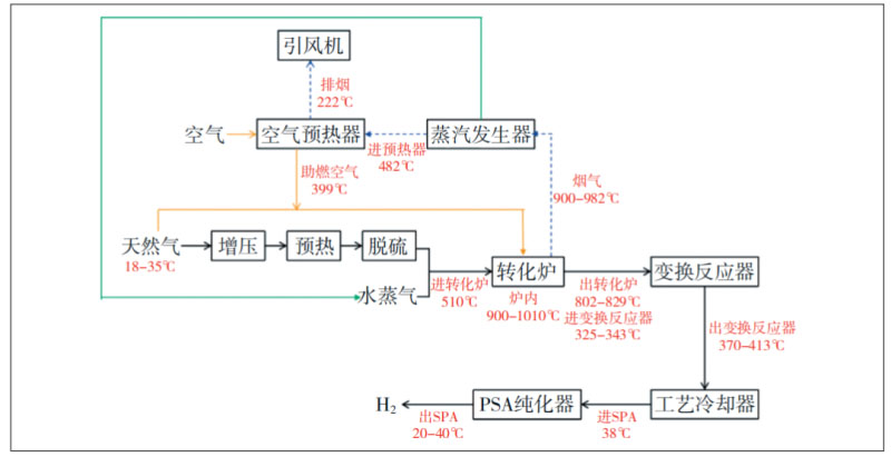利用化石燃料制氫有部分氧化和氣化兩種技術路徑,部分氧化是指燃料不完全燃燒而產(chǎn)生合成氣,可用燃料范圍廣,不需要外部熱量輸入,反應速度快,但氫氣產(chǎn)量低。氣化是煤在高溫高壓下部分燃燒生產(chǎn) 合成氣的過程,反應速度快,但固體燃料需要預處理。天然氣重整制氫包括轉化反應和變換反應,制得的氫氣純度高,工藝流程如圖2所示。首先對天然氣進行預處理,包括增壓、預熱和脫硫等環(huán)節(jié);然后與蒸汽按一定比例混合,在轉化爐中先進入混合氣預熱盤管,預熱到550℃~600℃,再進入轉化管,在催化劑層中,進行轉化反應CH4+H2O→CO+3H2,ΔH=206.1kJ/mol,反應壓力約2.5MPa,溫度約850℃;余熱回收后,在變換反應器中進行變換反應CO+H2O→CO2+H2,ΔH=-41.2kJ/mol,反應壓力約 2.5MPa,溫度約350℃;變換反應出來的氣體經(jīng)工藝 冷卻器冷卻后進入裝有多種吸附劑的PAS純化器中進 行氫氣提純,CO、CO2等被吸附;最后通過壓縮機加壓、充裝并儲存。轉化爐產(chǎn)生的廢氣進入蒸汽發(fā)生 器,生產(chǎn)轉化反應用蒸汽;廢氣再從蒸汽發(fā)生器進入空氣預熱器,預熱助燃空氣,用于維持轉化爐的燃燒 反應溫度;最后廢氣經(jīng)引風機排至大氣。