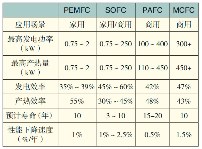 氫能用于建筑供熱的方式包括氫氣鍋爐和FC熱電聯(lián)供(fuel cell-combined heat and power,F(xiàn)CCHP)系統(tǒng)等?,F(xiàn)有燃氣鍋爐只允許摻混少量氫氣,若使用純氫作為燃料,需對裝置結構進行大規(guī)模改造。FC-CHP系統(tǒng)噪音小、排放少、效率高,是唯一超過全電系統(tǒng)運行效率的CHP系統(tǒng),并且由于其 電熱比很高,非常適用于熱負荷低的建筑。各類FCCHP性能參數(shù)見表2,其中,質子交換膜燃料電池 (proton exchange membrane fuel cells,PEMFCs)主要 用于民用供暖系統(tǒng),磷酸燃料電池(phosphoric acid fuel cells,PAFCs)和熔融碳酸鹽燃料電池(molten carbonate fuel cells,MCFCs)主要用于大型商用供暖系統(tǒng),固體氧化物燃料電池(solid oxide fuel cells,SOFCs)在民用和商用系統(tǒng)中均可使用。目前FCCHP價格較高,每kW發(fā)電量價格在1萬美元左右,但在過去10年內(nèi),價格已降低了一半左右,且使用壽命也有所增加,預計在2025年~2050年價格降至與其他 供熱系統(tǒng)相近水平。