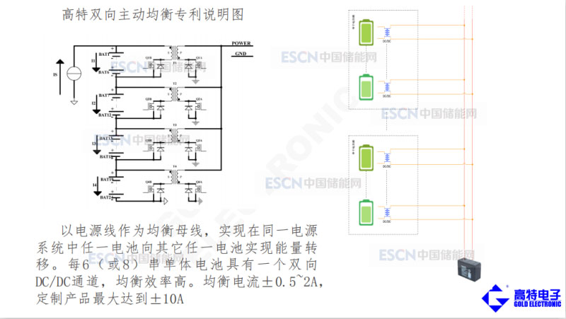 這是高特主動均衡的方案,在一簇電池當(dāng)中比如說200節(jié)電池,挑出最高10個(gè),最低10個(gè),最高的10個(gè)放電,最低10充電,實(shí)現(xiàn)任何電池之間的能量轉(zhuǎn)移。這是原理圖,高的電池放到電源端,如果有低的電池就給低的電池充,兩個(gè)電路一合并,就看到完成了從高電池到低電池的能量轉(zhuǎn)移。