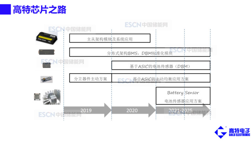 這是高特的芯片之路,現(xiàn)在完成的是采集和主動均衡的芯片,在2020到2025年已經(jīng)規(guī)劃了兩代芯片,下一步是SOC的ASIC應(yīng)用方案,最后要把芯片放到電芯內(nèi),這時(shí)候BMS將不復(fù)存在,我們都已經(jīng)內(nèi)置了,這是高特的終極目標(biāo),目前在做的分為兩步走,到2025年達(dá)成這個(gè)目標(biāo)。