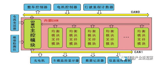 動(dòng)力電池BMS一端與電池相連,另一端又與整車的控制及電子系統(tǒng)相連接,BMS通過CAN總線接口與車載總控制器、電機(jī)控制器、能量控制系統(tǒng)、車載顯示系統(tǒng)等進(jìn)行實(shí)時(shí)通訊。