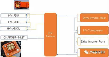 整個(gè)回路就變成如下圖所示,HVIL高壓互鎖物理是針對(duì)高壓回路的母線束連接器,這里就切分成三個(gè),整車外部連接的HVIL回路1(外部的一組連接回路)、內(nèi)部高壓連接器HVIL2(包含內(nèi)部的三個(gè)連接器)和快充高壓線束和連接器的完整性。