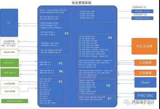 下圖是我通過(guò)線路原理圖做了分解,整個(gè)電池管理系統(tǒng)面向內(nèi)部主要連接快充連接器、溫度傳感器、正負(fù)接觸器、電流傳感器、可控熔絲、內(nèi)部的PCS(DCDC和OBC)的單元菊花鏈CMU控制器,還有面向外部的供電單元、外部HVIL電路、充電控制板、動(dòng)力總成CAN。