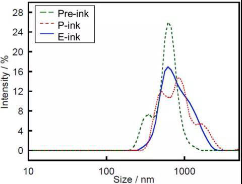Pre-ink、E-ink和P-ink三種漿料Pt/C的聚合物吸附率分別為97、23和0 %,平均粒徑在550、780和1030 nm。分散溶劑疏水性的增加導致Pt/C吸附的聚合物溶解。由于聚合物在Pre-ink中的吸附作用Pt/C會充分分散,在E-ink和P-ink中添加溶劑將聚合物從Pt/C中消除,從而導致平均聚集體尺寸(average aggregate size)變大