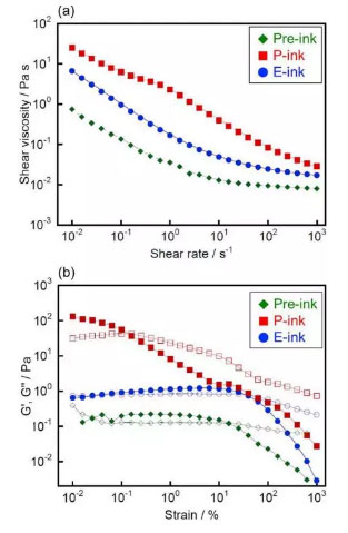 漿料流變特性(a:剪切率vs粘度;b:應變vs模量)