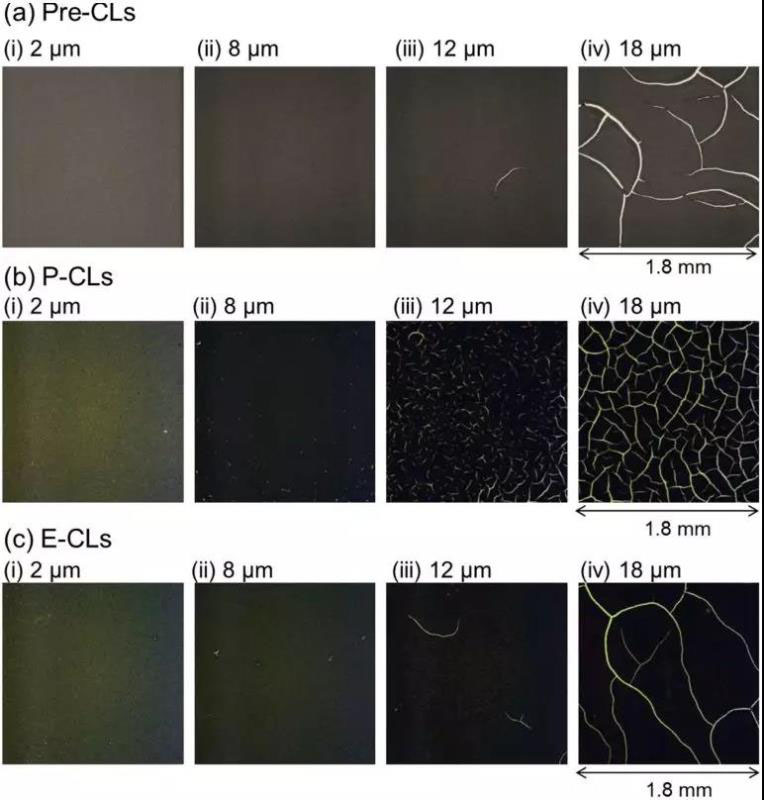 產(chǎn)生裂紋的原因可能是小孔、Pt/C和聚合物團塊,針孔或密度不均。由于應力的發(fā)展,裂紋開始向不同的方向傳播。形狀變化機制如下:在各向同性應力作用下,I型裂紋在垂直主應力的方向傳播。當裂紋尖端處的主應力方向由于抗斷裂性(fracture resistance)而變化時,I形裂紋會擴展為U形。在不均勻的微觀結構(如小缺陷)產(chǎn)生的各向異性應力下,I形裂紋變?yōu)閂形裂紋。T形和Y形裂紋是現(xiàn)有I形和V形裂紋的SC裂痕雛形(釋放另一個方向的拉應力)。因此,多個I形裂紋表明P-CLs表現(xiàn)出脆性破壞,而U形裂紋表明E-CLs和Pre-CLs具有較高的斷裂韌性。P-CL的V型和Y形裂紋表明,P-CL包含共聚焦顯微鏡無法看到的小缺陷。