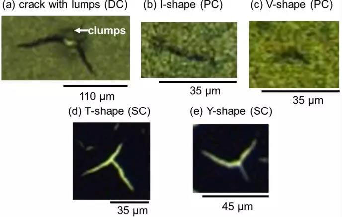 裂痕類別(a:E-CLs(8 μm);b:P-CLs(8 μm);c:P-CLs(8 μm);d:P-CLs(12 μm);e:P-CLs(12 μm))