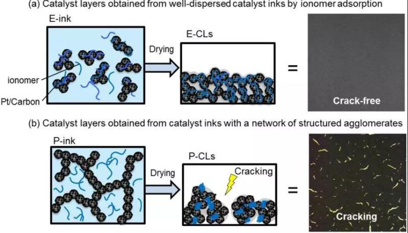 CCT(臨界裂紋厚度)差異示意圖(a:通過聚合物吸附分散良好的的催化劑漿料(E-ink)在E-CL中產(chǎn)生均一的Pt/C和聚合物物分布;b:催化劑漿料(P-ink)具有結構化的團聚體網(wǎng)絡,可產(chǎn)生致密的聚集體,并具有小的Pt/C裸孔和P-CL中的自組織游離聚合物)