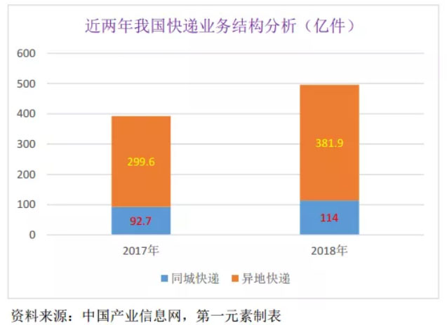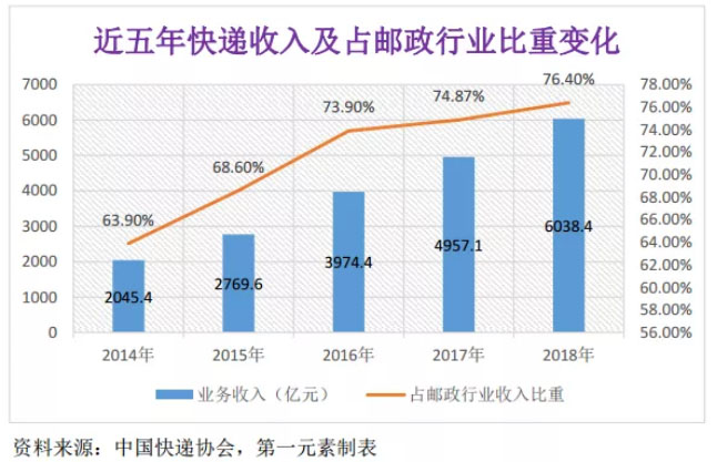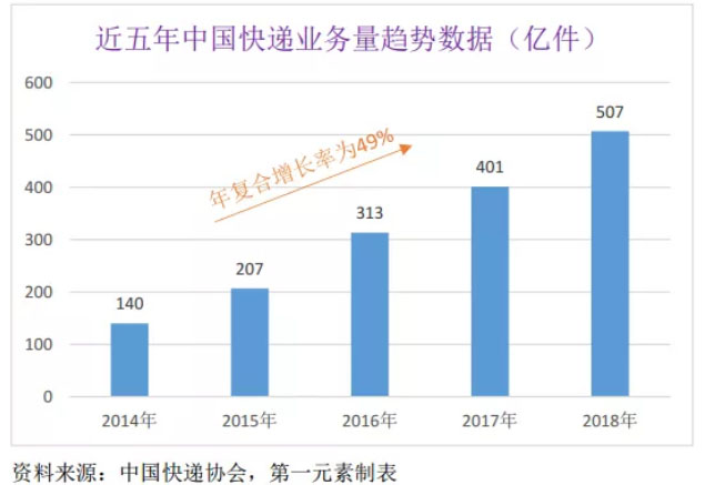 2014~2018年,國內(nèi)快遞業(yè)務量年均復合增長率達到49%。