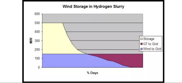 其二是使用氫懸浮液將風(fēng)能儲(chǔ)存起來。風(fēng)不可能一年四季不間斷的吹,而電網(wǎng)又不能僅僅依靠風(fēng)力發(fā)電供應(yīng)所有的電能。一般說來,風(fēng)力發(fā)電廠輸出的電能只有15%可作為可靠能量。這意味著對(duì)于一個(gè)500兆瓦的風(fēng)力發(fā)電廠,僅僅有75兆瓦被ISO視為可發(fā)電的能量。通常為保證風(fēng)力發(fā)電輸出電能的穩(wěn)定性,需要附加一個(gè)天然氣電廠,這就在一定程度上影響了風(fēng)力發(fā)電的零碳排放。以下是一個(gè)500兆瓦風(fēng)力發(fā)電廠提供的150兆瓦發(fā)電量100%用氫儲(chǔ)存并驅(qū)動(dòng)燃?xì)廨啓C(jī)發(fā)電的例子。在這個(gè)例子中,ISO認(rèn)為風(fēng)力發(fā)電占電網(wǎng)30%的電能。