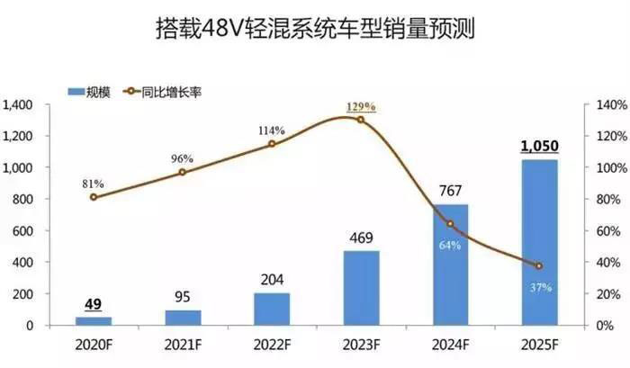 “48V 輕混系統(tǒng)將在中國迎來爆發(fā)式的增長,并最終站到市場 "C 位 " 上。這是全球信息提供商 IHS Markit 最新發(fā)布的數(shù)據(jù)成果。數(shù)據(jù)顯示,48V 輕混將在中國迎來高速發(fā)展期,并在 2020 年至 2025 年的五年時間里,實現(xiàn)年均增長率 85%,年銷售量從 49 萬臺增長到 1050 萬臺。其中,2023 年市場增速最快,較上一年同比增長 129%,此后,市場增速趨穩(wěn)?!?