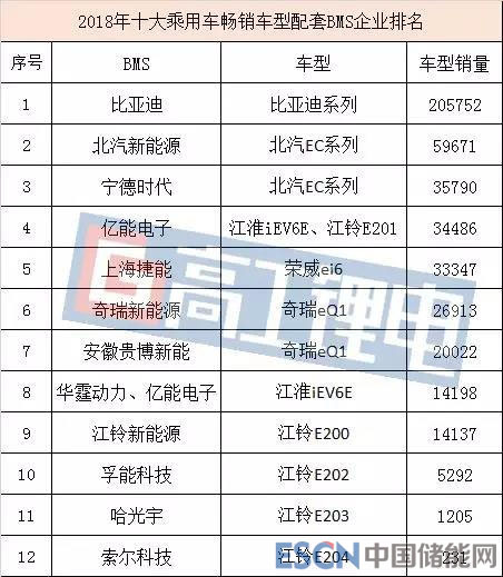 高工鋰電(微信公眾號(hào):weixin-gg-lb)梳理發(fā)現(xiàn),共計(jì)有12家BMS企業(yè)為十大乘用車(chē)暢銷(xiāo)車(chē)型配套。具體為:寧德時(shí)代、北汽新能源、比亞迪、安徽貴博新能、奇瑞新能源、億能電子、華霆?jiǎng)恿Α⑸虾=菽?、江鈴新能源、孚能科技、哈光宇、索爾科技?