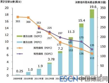 在2009年產(chǎn)品推廣前夕,日本政府同意每套燃料電池補貼140萬日元或者制造成本的一半,并做出補貼多年的承諾。雖然每套設(shè)備的補貼力度下降,但是總的補貼預(yù)算不斷升高。在2009年大約安裝了2300套燃料電池設(shè)備,現(xiàn)在這個數(shù)字已經(jīng)慢慢增長至超過12000套,而每套設(shè)備的補貼則降至了500000至600000日元。而從2012年開始銷售量差不多翻倍。2015年ENE-FARM的補貼金額達到了222億日元,這一輪補貼到2016年年底已經(jīng)結(jié)束。