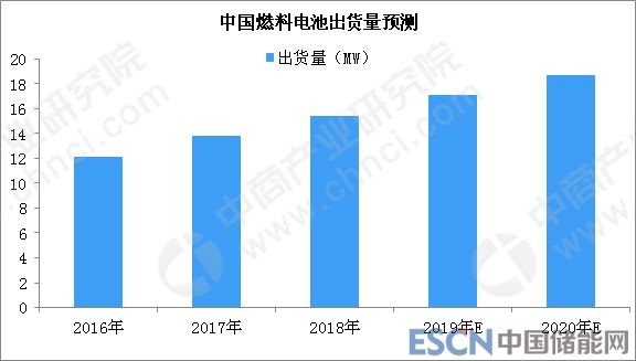 據(jù)統(tǒng)計數(shù)據(jù)顯示,2015年我國燃料電池出貨量約10.5MW,同比增長14.1%,出貨量首次超10MW。未來,燃料電池市場將持續(xù)增長,預(yù)計到2019年出貨量將超17MW。