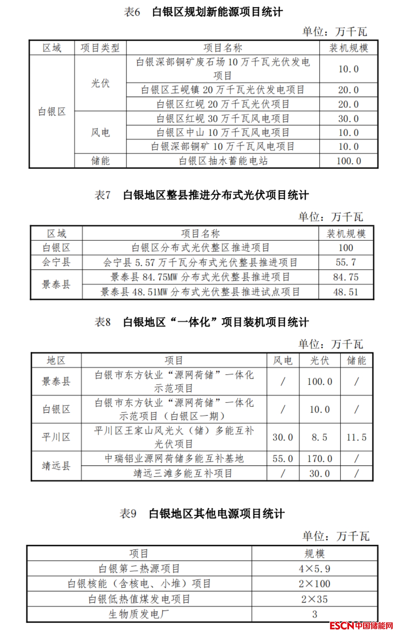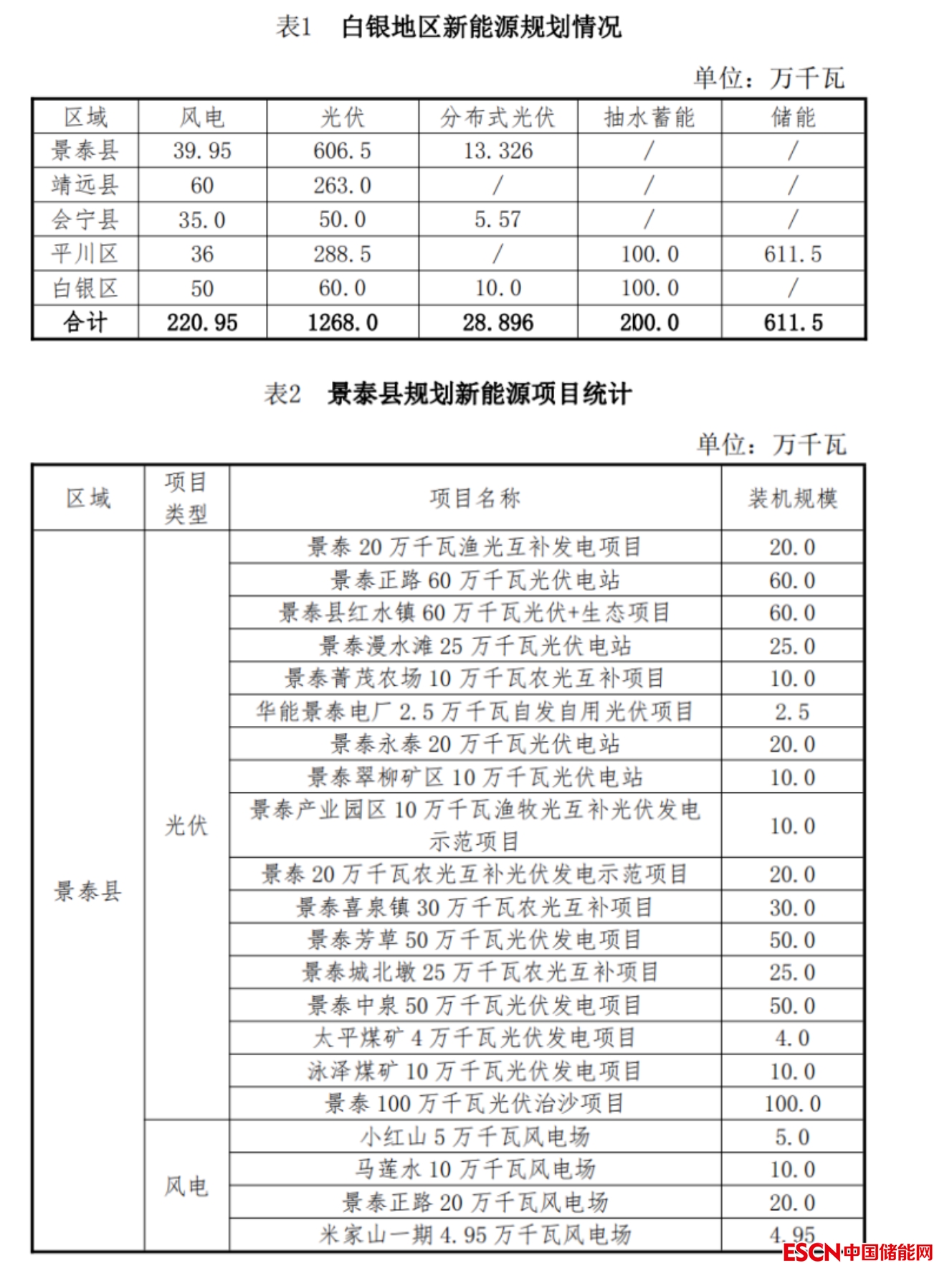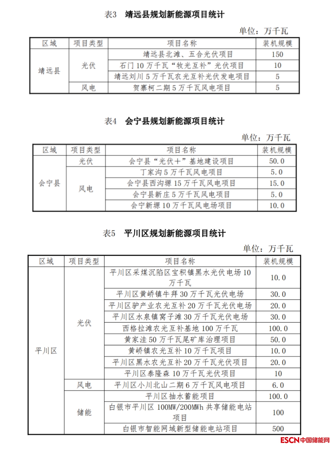 根據(jù)白銀地區(qū)能源規(guī)劃表,白銀市計(jì)劃在景泰縣、靖遠(yuǎn)縣、會(huì)寧縣、平川區(qū)以及白銀區(qū)規(guī)劃風(fēng)電220.95萬(wàn)千瓦,光伏1268萬(wàn)千瓦,分布式光伏28.896萬(wàn)千瓦,抽水蓄能200萬(wàn)千瓦以及儲(chǔ)能611.5萬(wàn)千瓦。具體規(guī)劃情況以及項(xiàng)目名單如下: