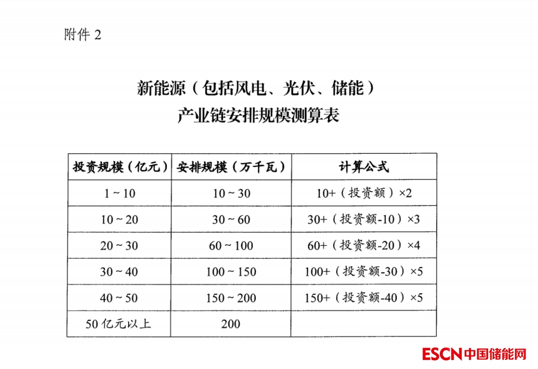 風(fēng)電產(chǎn)業(yè)鏈、光伏產(chǎn)業(yè)鏈、儲能裝備制造均可以申請,具體的名單可參考文末附件。不同投資規(guī)模安排的新能源規(guī)模如下表所示。