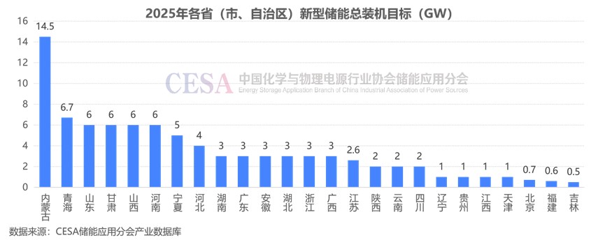 據(jù)CESA儲能應(yīng)用分會產(chǎn)業(yè)數(shù)據(jù)庫不完全統(tǒng)計的全國25個省(市、自治區(qū))2025年的新型儲能裝機目標(biāo)中山東、甘肅、山西、河南總裝機目標(biāo)均為6GW,并列全國第三。