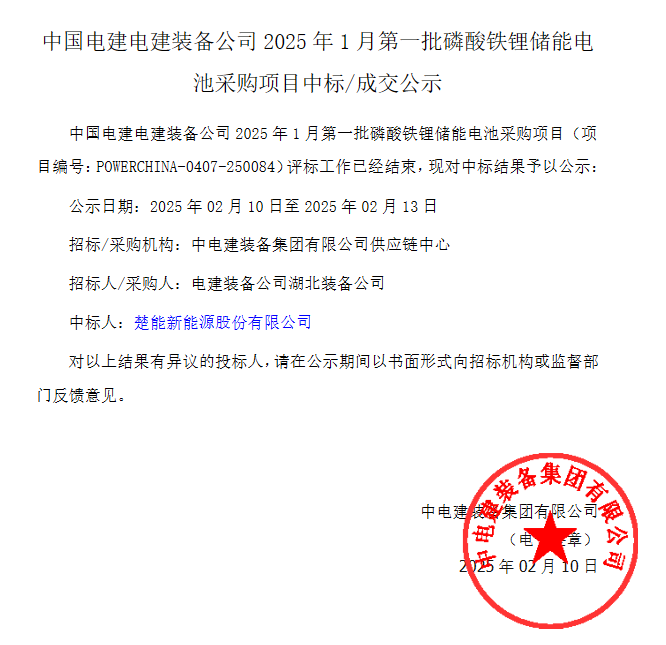 中國(guó)儲(chǔ)能網(wǎng)訊:2月10日,中國(guó)電建電建裝備公司2025年1月第一批磷酸鐵鋰儲(chǔ)能電池采購(gòu)項(xiàng)目中標(biāo)結(jié)果公布,楚能新能源成為唯一中標(biāo)人。據(jù)悉,該項(xiàng)目為總?cè)萘?00MWh的314Ah磷酸鐵鋰儲(chǔ)能電池采購(gòu)。