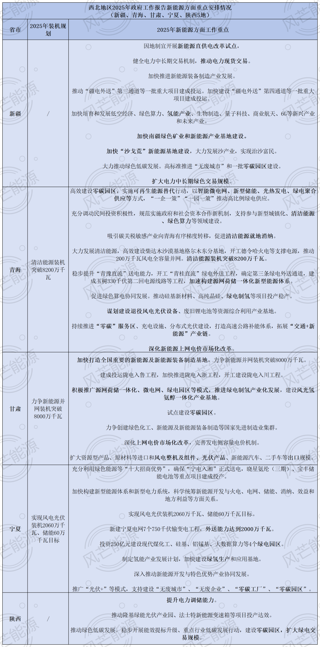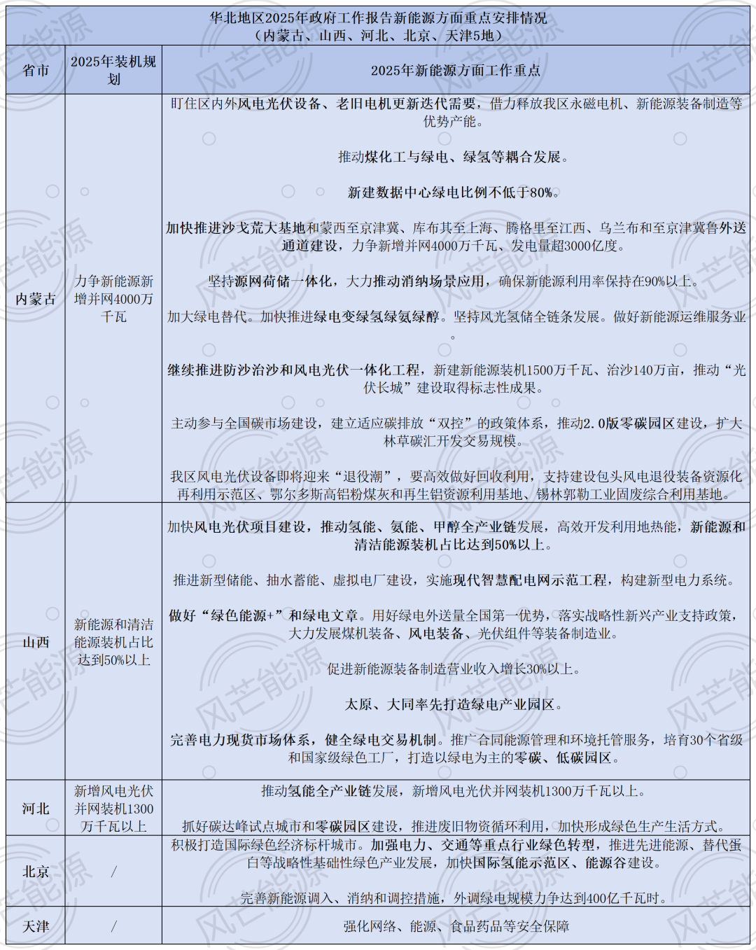 據(jù)「風(fēng)芒能源」統(tǒng)計(jì),14省/市明確了2025年電力裝機(jī)目標(biāo),其中,甘肅省明確提出,力爭(zhēng)新能源并網(wǎng)裝機(jī)突破8000萬(wàn)千瓦;內(nèi)蒙古提出力爭(zhēng)新能源新增并網(wǎng)4000千瓦;云南表示其開(kāi)工、投產(chǎn)新能源項(xiàng)目各1600萬(wàn)千瓦以上;山西、海南則針對(duì)裝機(jī)比例設(shè)定目標(biāo):2025年,山西省新能源和清潔能源裝機(jī)占比達(dá)到50%以上;海南全省清潔能源裝機(jī)比重達(dá)85%左右。