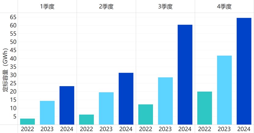 圖 2022-2024年各季度新型儲能電站項目采招落地容量