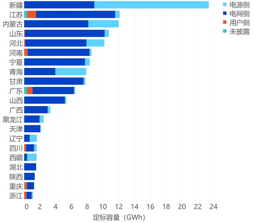 2024年,10個省市自治區(qū)定標(biāo)規(guī)模超過6GWh,新疆、江蘇、內(nèi)蒙古、山東、河北位居前五,中標(biāo)(候選人)公示規(guī)模均超10GWh,前五總落地規(guī)模約占全國的一半。