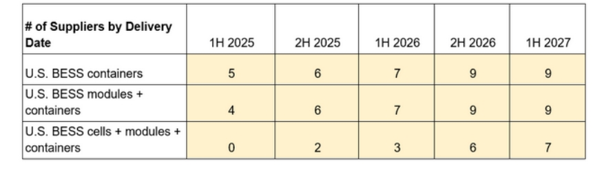 與此同時(shí),采購(gòu)平臺(tái)Anza Renewables公司發(fā)布的數(shù)據(jù)表明,目前以及未來(lái)幾年美國(guó)電池、模塊和電池儲(chǔ)能系統(tǒng)集裝箱的供應(yīng)商數(shù)量預(yù)計(jì)將呈現(xiàn)增長(zhǎng)趨勢(shì)。