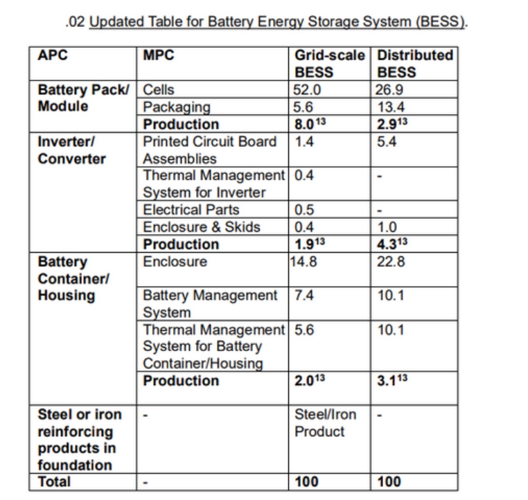 這些類(lèi)別具體涵蓋了電池組/模塊、逆變器/轉(zhuǎn)換器、電池集裝箱/外殼,以及基礎(chǔ)構(gòu)件中的鋼鐵制品。與2024年5月發(fā)布的表格一樣,電網(wǎng)規(guī)模電池儲(chǔ)能系統(tǒng)與分布式電池儲(chǔ)能系統(tǒng)在相關(guān)數(shù)據(jù)上有所不同。