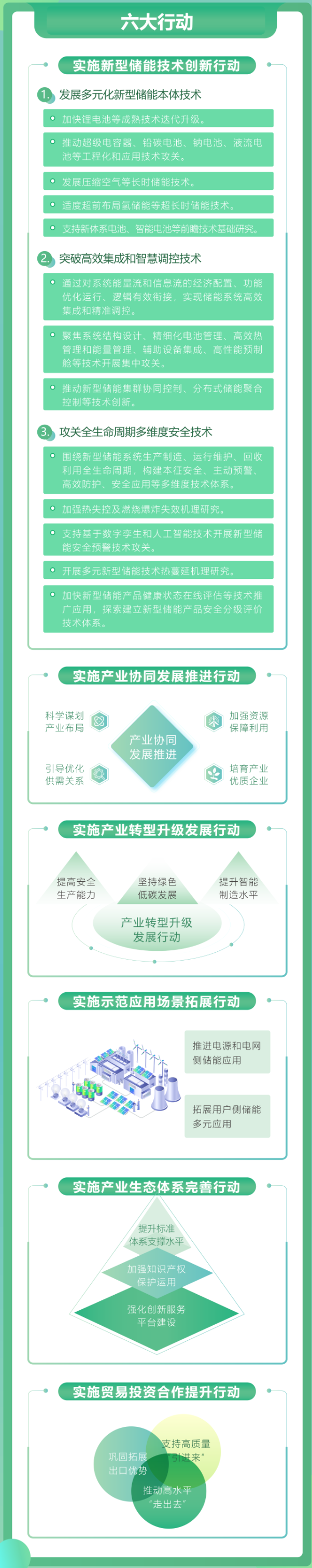 記者注意到,《方案》共提出實施新型儲能技術創(chuàng)新行動、實施產(chǎn)業(yè)協(xié)同發(fā)展推進行動、實施產(chǎn)業(yè)轉型升級發(fā)展行動、實施示范應用場景拓展行動、實施產(chǎn)業(yè)生態(tài)體系完善行動、實施貿(mào)易投資合作提升行動等六大行動。