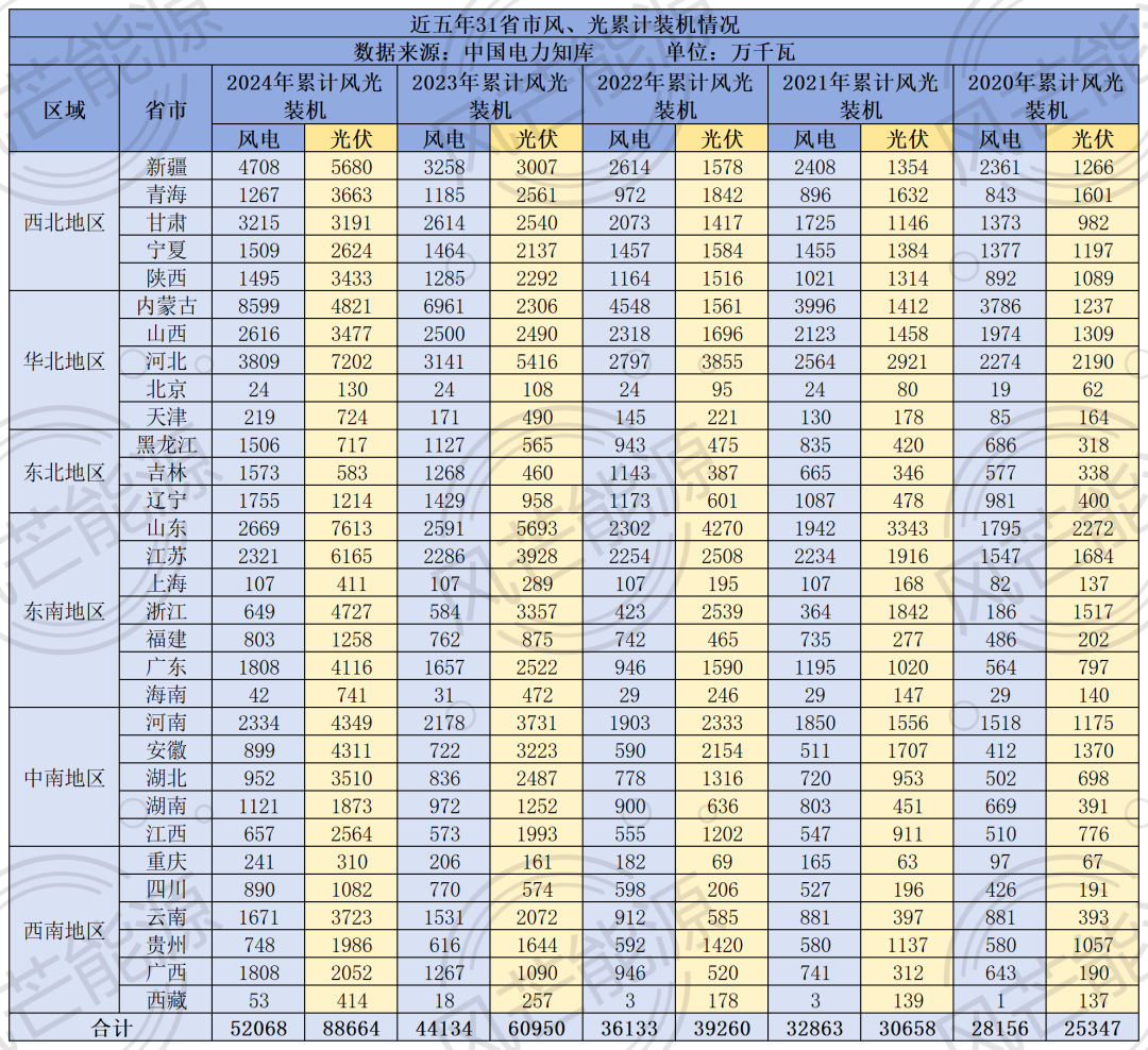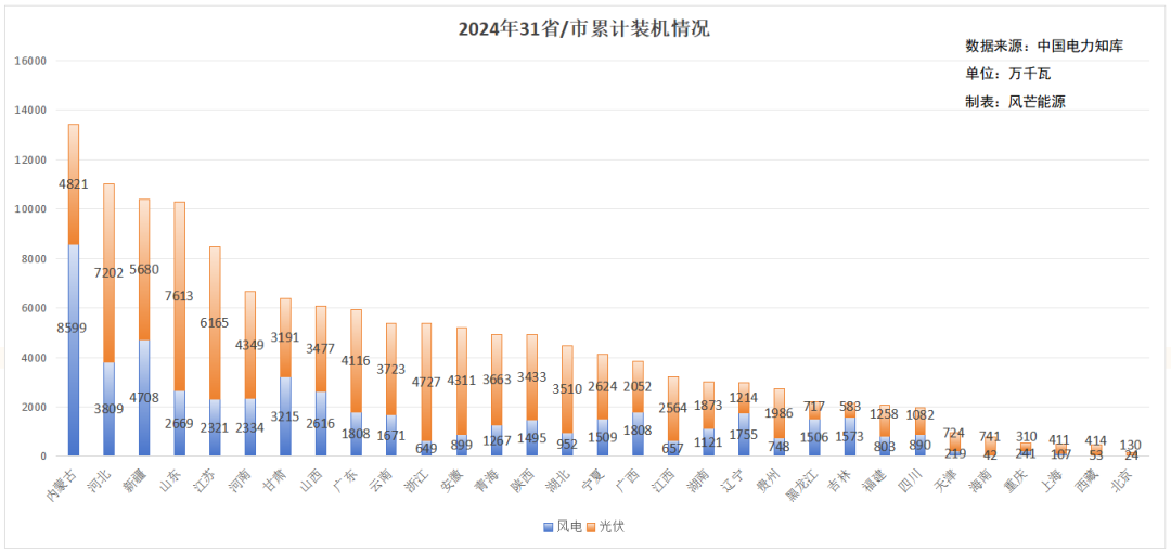 分地區(qū)來看,內(nèi)蒙古、河北、新疆及山東4省風(fēng)、光累計(jì)裝機(jī)突破1億千瓦;超5成地區(qū)風(fēng)、光裝機(jī)突破4000萬千瓦;8成地區(qū)新能源裝機(jī)超1000萬千瓦。