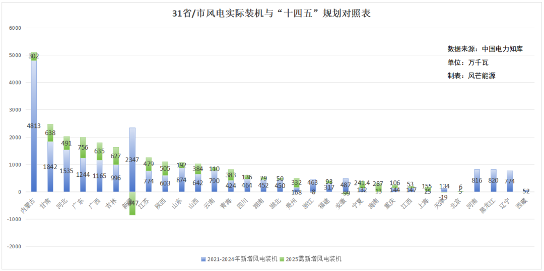 注:部分省份未明確“十四五”新增風(fēng)電裝機(jī)容量,故圖中未顯示2025年需新增風(fēng)電裝機(jī)數(shù)據(jù)